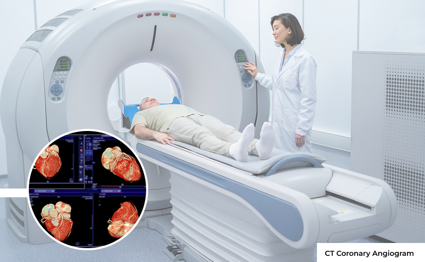 A CT scan with IV contrast dye. It shows blockages in heart arteries non-invasively.